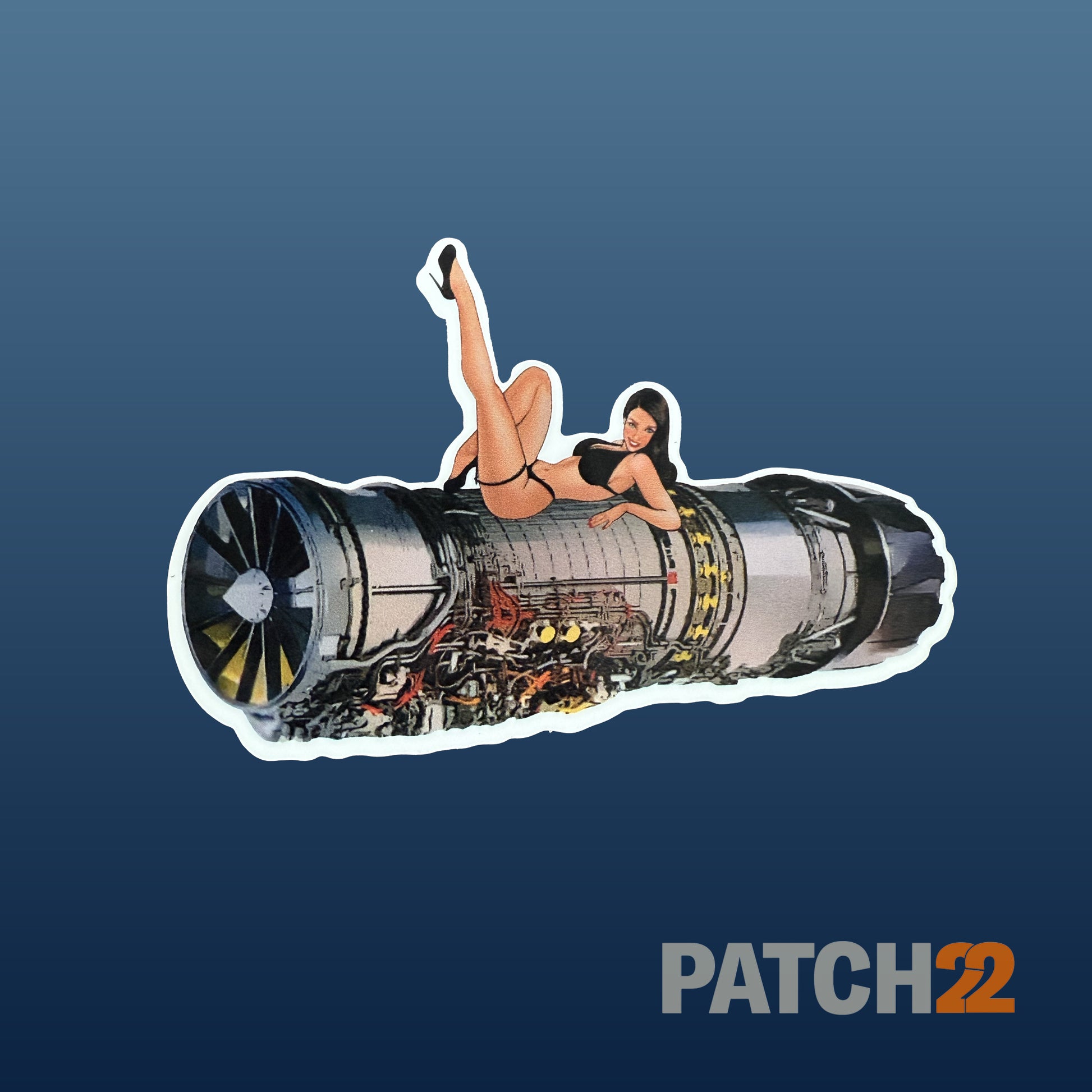 The F110 Pin-Up Sticker features retro nose-art style artwork of a vintage pin-up girl laid across a detailed F110 jet engine. Perfect for aviation enthusiasts, maintainers, and collectors who love bold morale art.